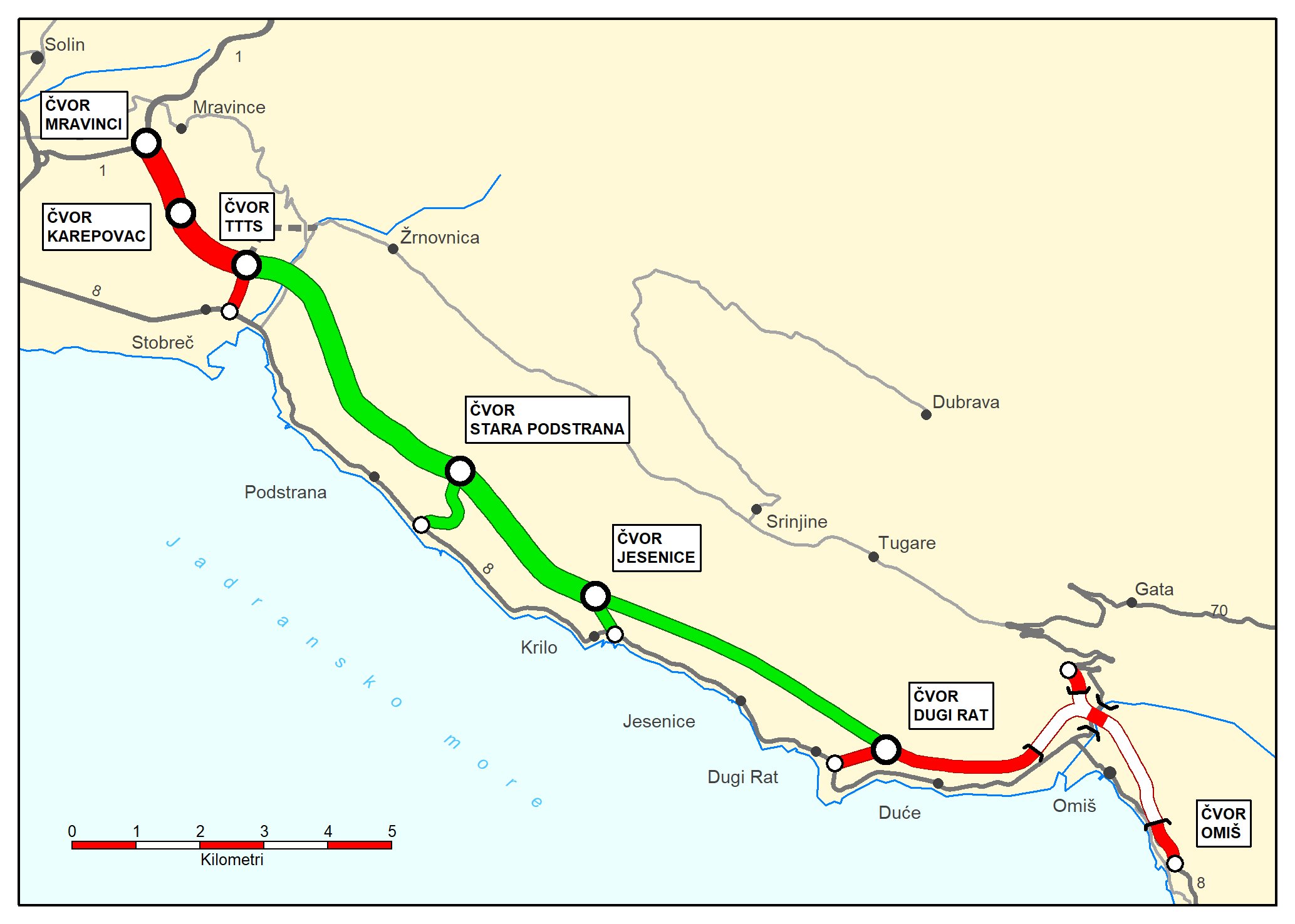 Brza cesta Solin – Stobreč – Dugi Rat – Omiš, sadrži spojne ceste čvorište TTTS – Stobreč, čvorište Stara Podstrana – Podstrana, čvorište Jesenice – Jesenice i čvorište Dugi Rat – Dugi Rat.